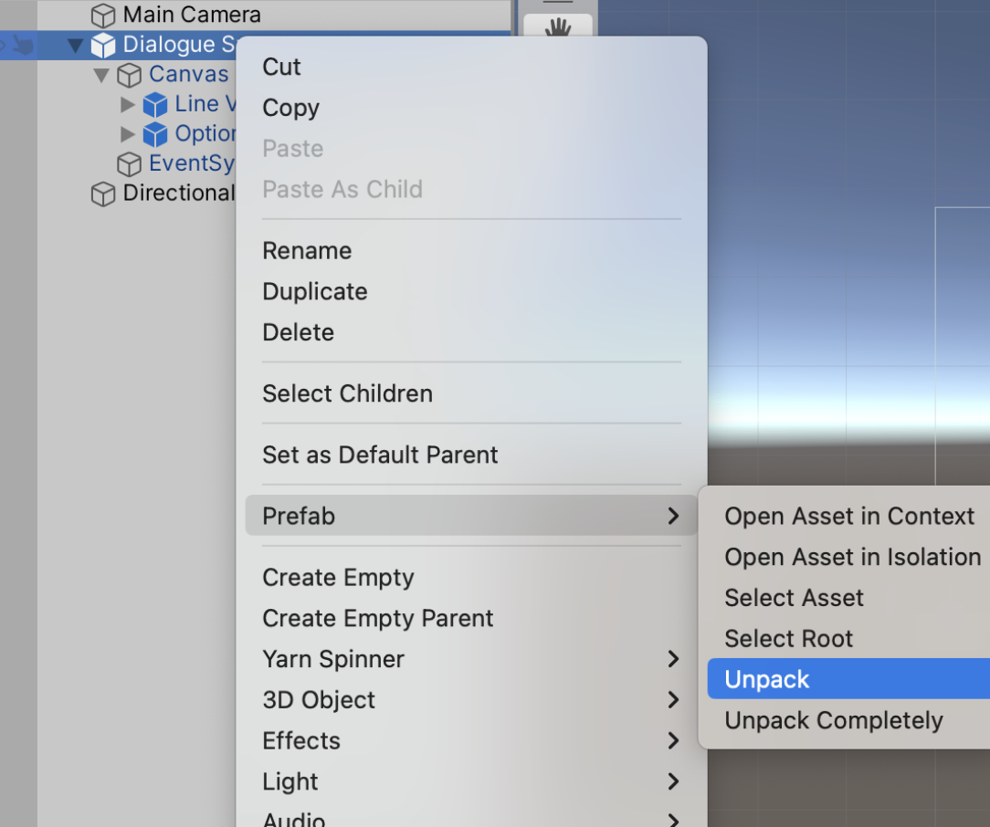 Back in Unity, choose the Dialogue Runner that you added to the Hierarchy, right-click it and choose Prefab -> Unpack.