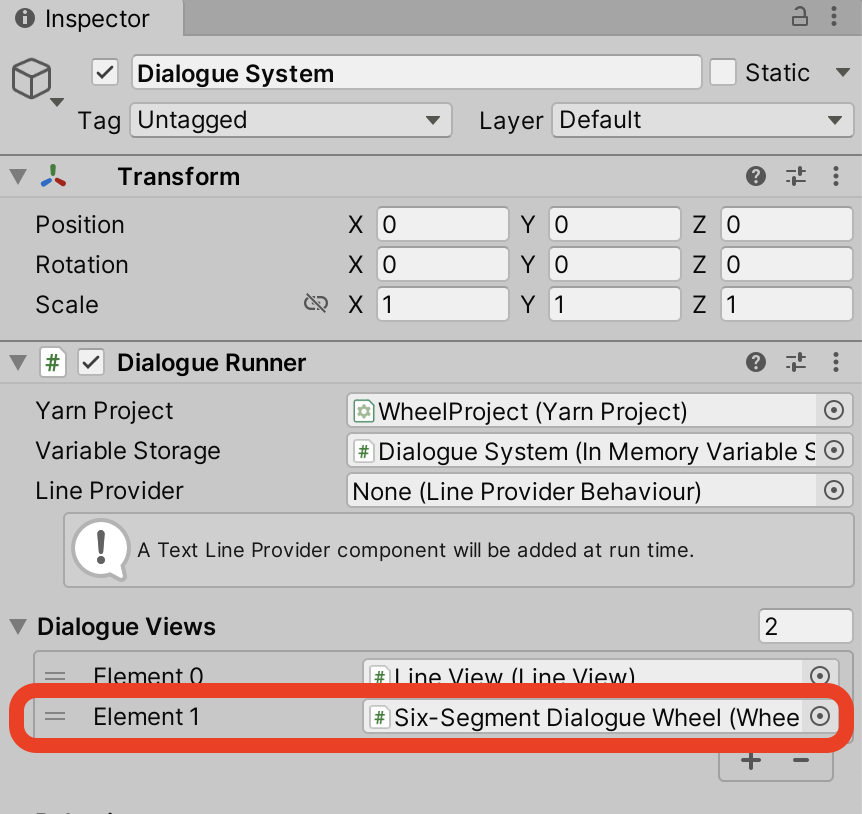 To make the Dialogue System aware of the Six-Segment Dialogue Wheel, select it (the Dialogue System) in the Hierarchy, and drag the Six-Segment Dialogue View from the Hierarchy into the Element 1 slot of the Dialogue Views section in the Inspector: