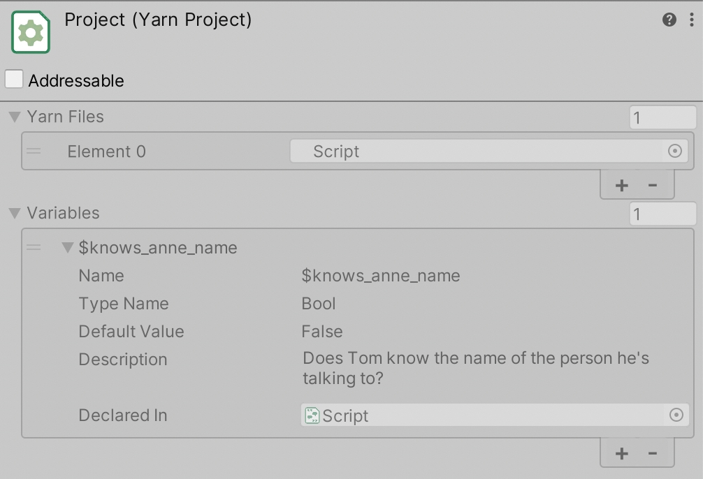 A Yarn Project's inspector shows information about every variable that are used in the Yarn scripts. This section of the Inspector shows the name, type, description, and default value of each variable.