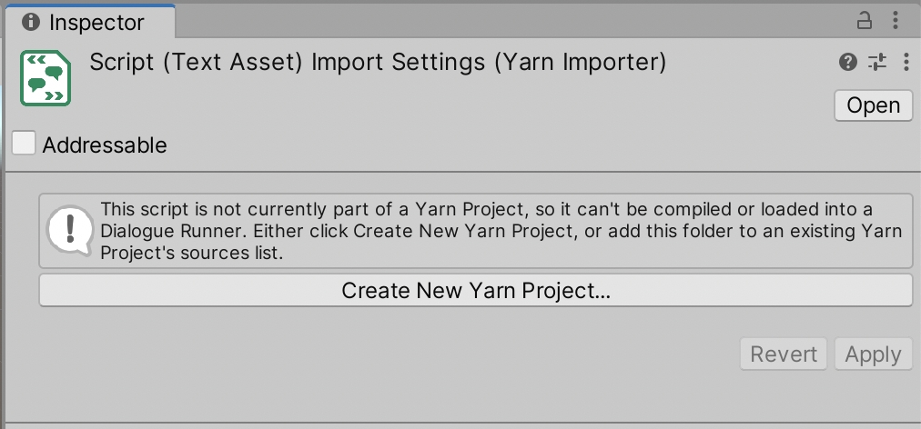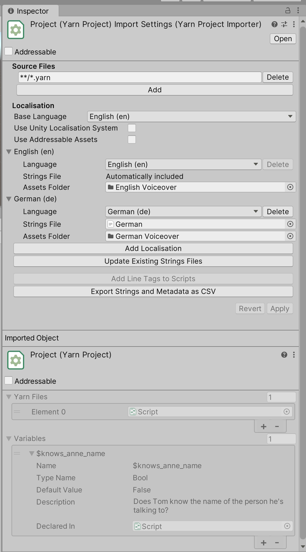A Yarn Project is a file that links multiple Yarn Spinner Scripts together.