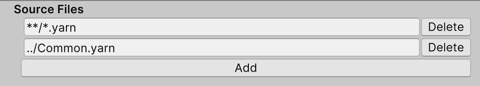 You can change the locations that a Yarn Project looks for Yarn Scripts by modifying the Source Files setting. Each entry in the Source Files setting is a search pattern.