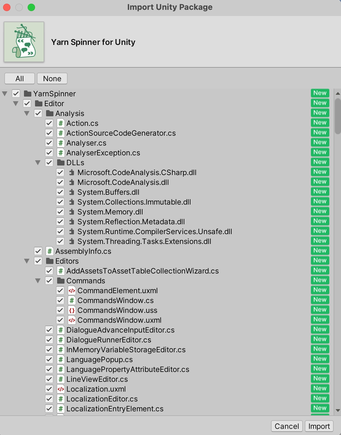 This will trigger the Import Unity Package workflow, where you can use the Import button to add the Yarn Spinner for Unity package to your project: