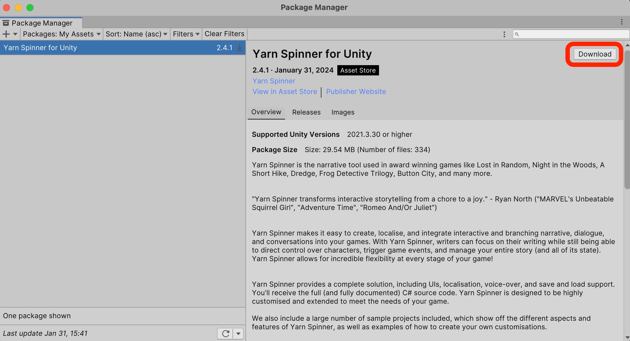 Once you've purchased Yarn Spinner for Unity, you'll find the Add to Cart button replaced by an Open in Unity button. Click this button to launch Unity, and the Package Manager will locate your purchased package: