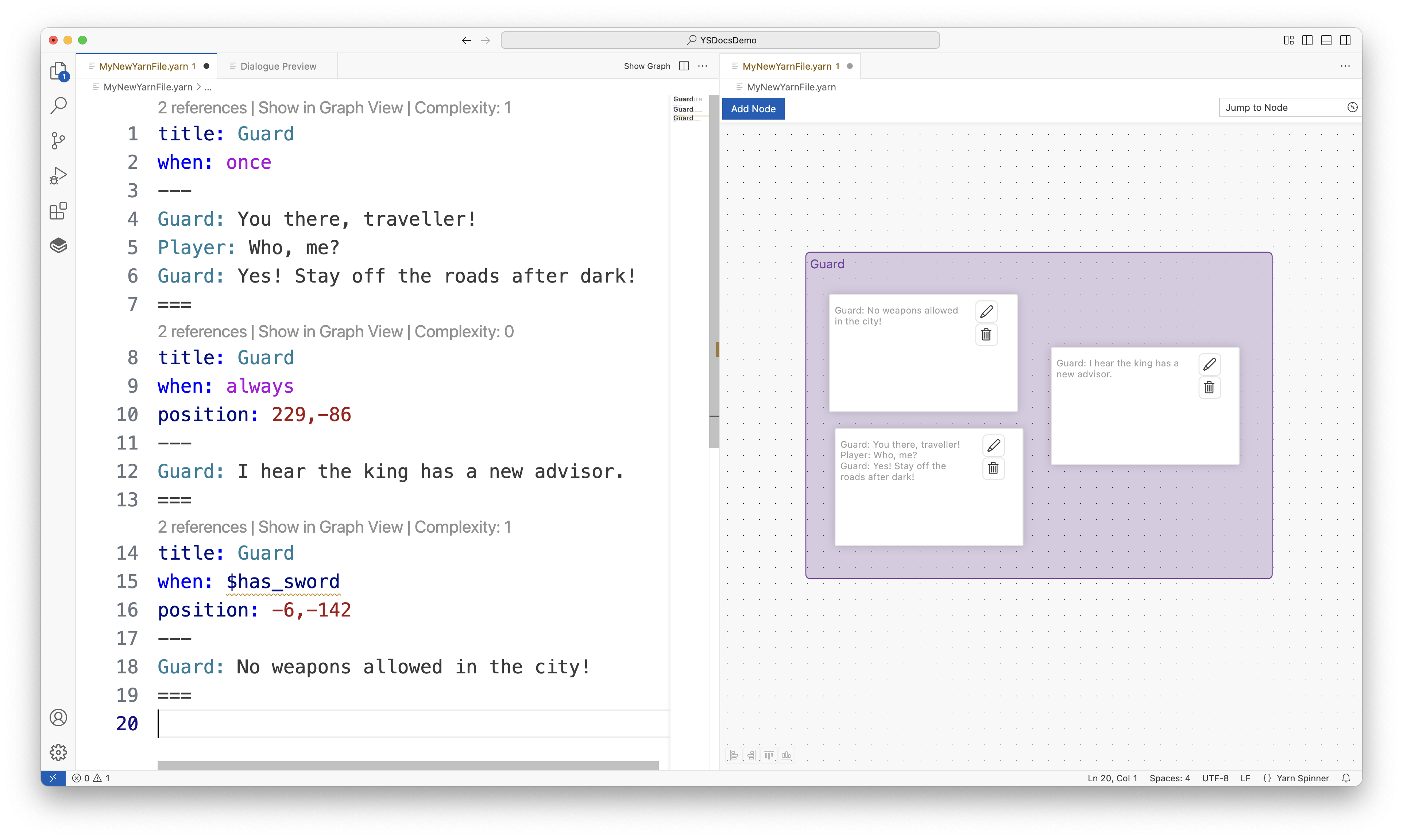 In Yarn Spinner, you can also create node groups. A **node group** is collection of nodes that share the same name that Yarn Spinner will choose from.