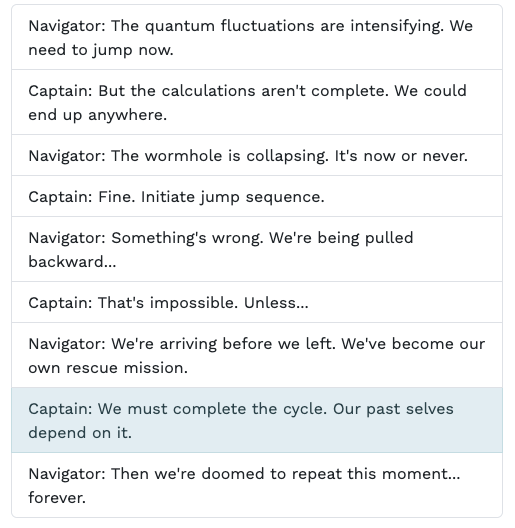 And if the player chooses `Captain: We must complete the cycle. Our past selves depend on it.` , then the line from the Navigator will be delivered (`Navigator: Then we're doomed to repeat this moment... forever.`) and then three options for the Captain will be provided: