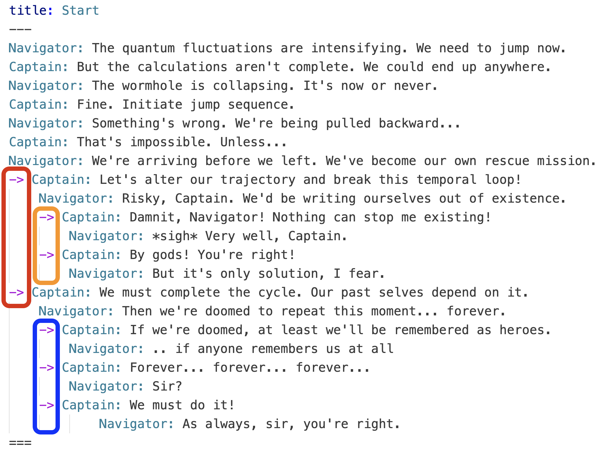 For example, if the player chooses `Captain: Let's alter our trajectory and break this temporal loop!` , then the line from the Navigator will be delivered (`Navigator: Risky, Captain. We'd be writing ourselves out of existence.` ) and then two options for the Captain will be provided: