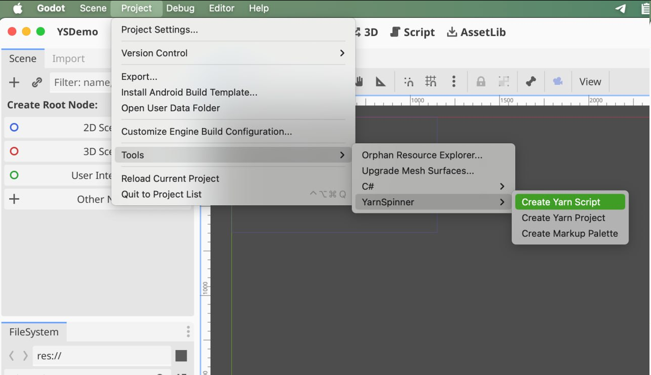 <figure><img src="https://463139507-files.gitbook.io/~/files/v0/b/gitbook-x-prod.appspot.com/o/spaces%2FGAKWviXNATe9kDFWZAco%2Fuploads%2Fgit-blob-cab7f082d8445907ec48446d25cf54ac37c864e4%2FYarnSpinnerGodot-Create-YarnProject.png?alt=media" alt="" width="563"><figcaption><p>Opening the menu to create a new .yarnproject file.</p></figcaption></figure>