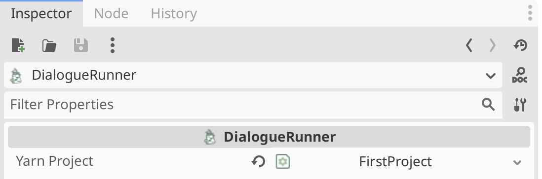 Select the `DialogueRunner` node in the Scene dock, and look to the Inspector. Selecting "Editable Children" earlier in the guide is what will allow you to see the `DialogueRunner` node and edit its options. Assign the Yarn Project you created to the `DialogueRunner` by dragging the `FirstProject.tres` Yarn Project from the FileSystem dock into the Yarn Project slot of the Inspector: