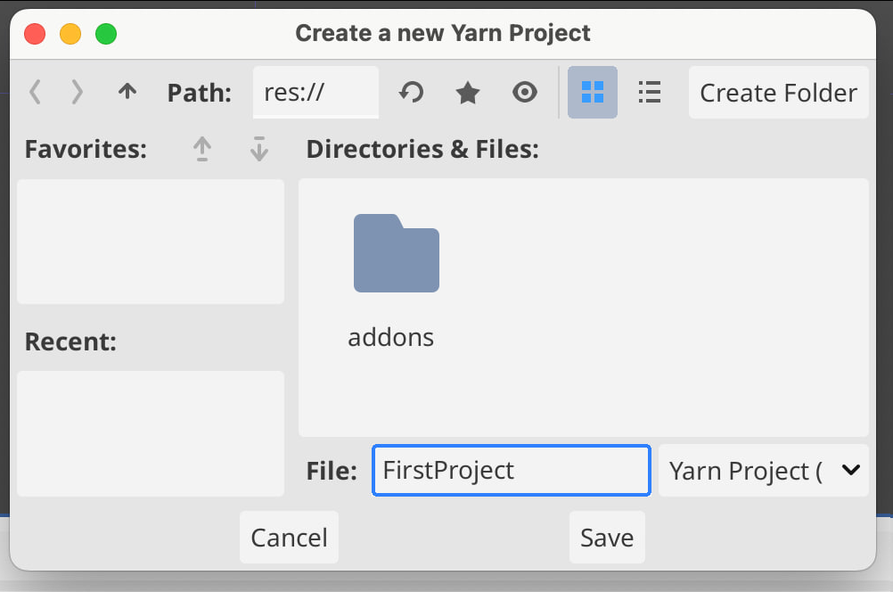 Then choose a directory to save your new YarnProject in. For example, you can save it to the root of your project. Name the new Yarn Project `FirstProject.yarnproject`: