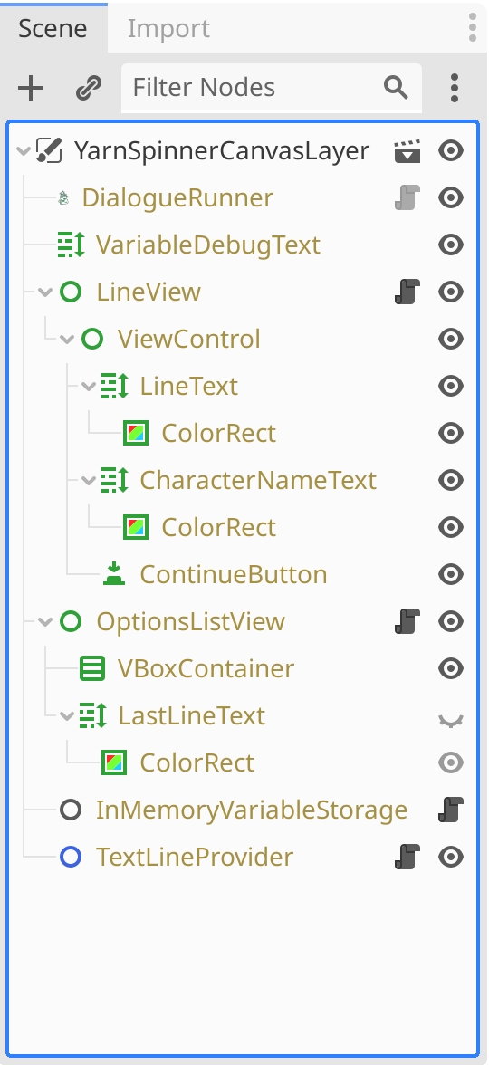 Your Scene dock will look like this showing a node hierarchy that's entirely based on the DefaultDialogueSystem.tscn