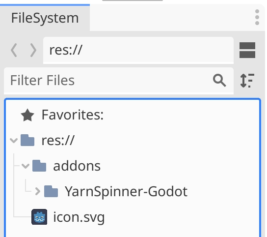 directory in a local copy of Yarn Spinner for Godot.Put a copy of this directory into your new Godot project, either by dragging the folder in your file manager (e.g. Finder or Explorer) into the folder of the Godot project, or by dragging from your file manager into the FileSystem dock of your Godot project:
