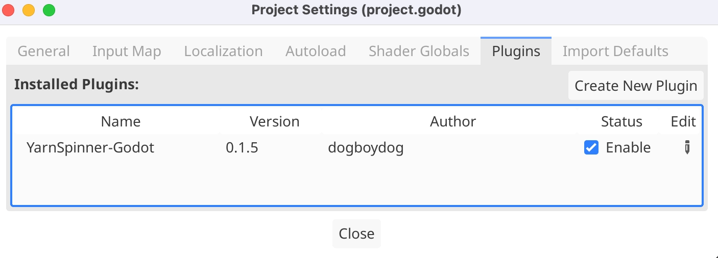 Once the build is complete, open the Project menu -> Project Settings, change to the Plugins tab, and tick the enabled box next to the Yarn Spinner for Godot plugin: