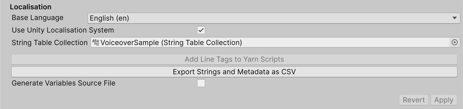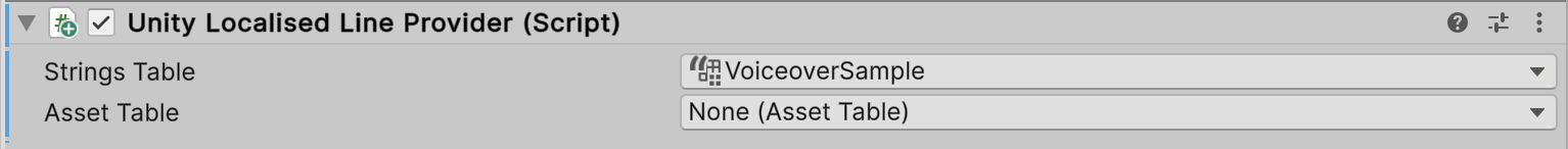 ![A Unity Localised Line Provider, configured with a String Table for line text, and an Asset Table for voice-over.](https://463139507-files.gitbook.io/~/files/v0/b/gitbook-x-prod.appspot.com/o/spaces%2FGAKWviXNATe9kDFWZAco%2Fuploads%2Fgit-blob-9aaf47f93e8f460b9662f4b9e6eca0efc8ea8b0f%2Fyarn-unity-localised-line-provider.png?alt=media)