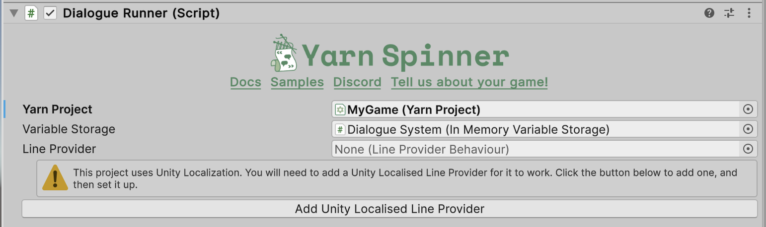 The Dialogue Runner's Inspector will tell you when you need to use a Unity Localised Line Provider. You can click the button it provides to quickly add and configure one. You can also set one up manually, using the Add Component menu.