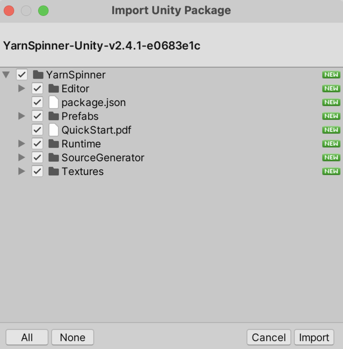 And with that, you're ready to use Yarn Spinner! You might also want to download and import the Yarn Spinner for Unity Samples as a `.unitypackage`, from here.