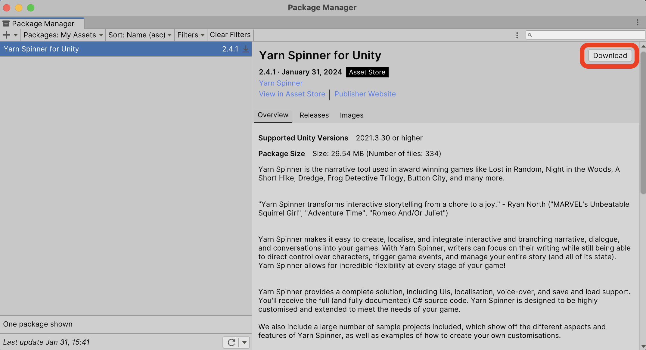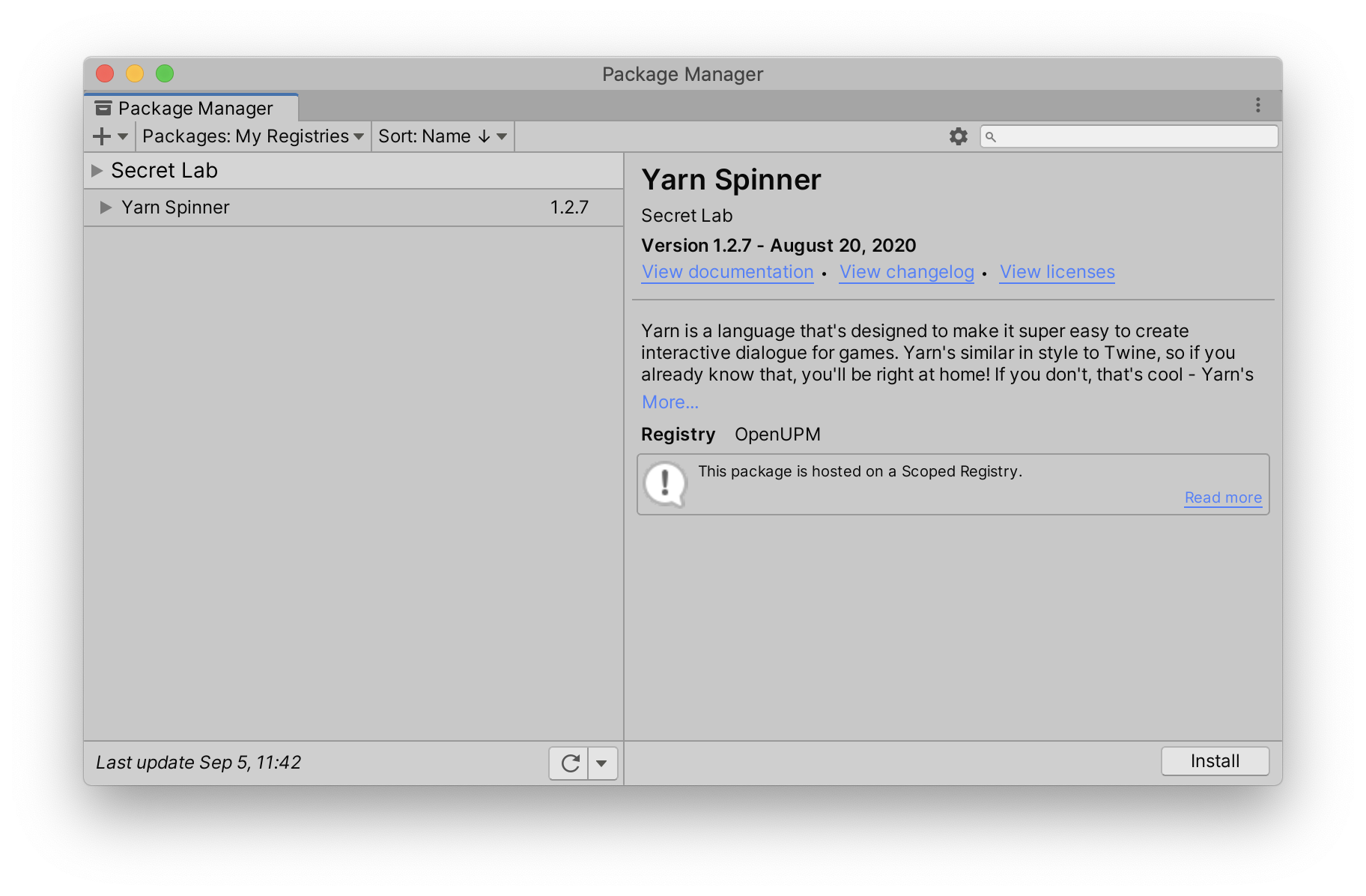 1. Yarn Spinner will appear in the list. Select it, and click Install.