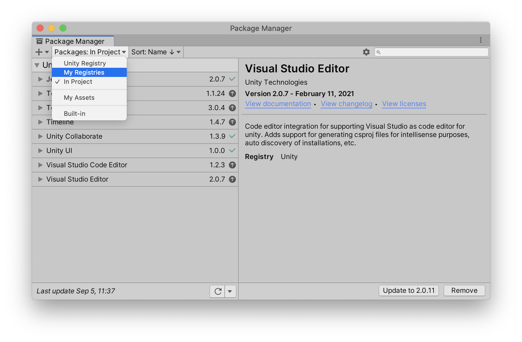 2. In the toolbar, click Packages: In Project, and choose My Registries.