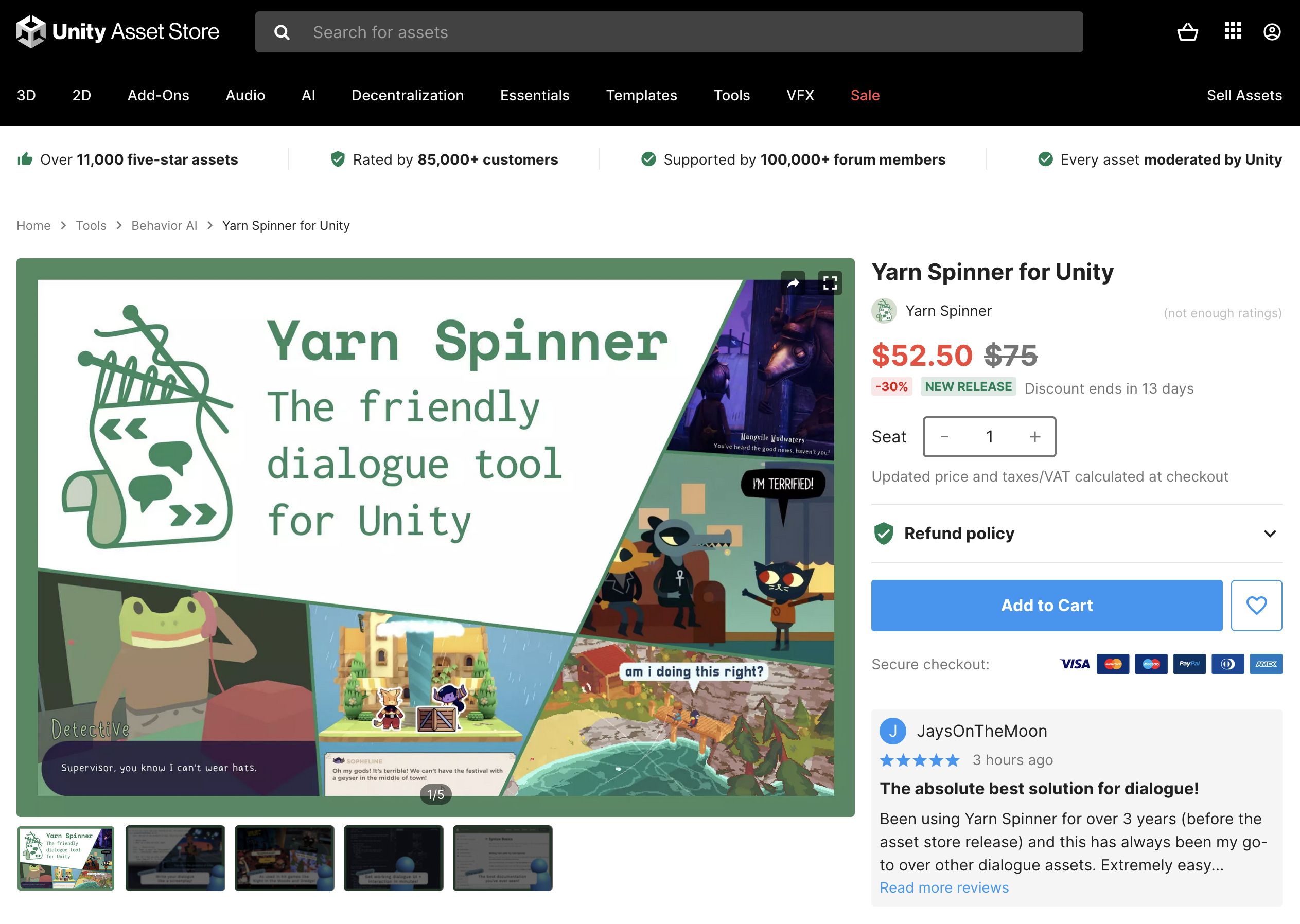 First, [visit the Unity Asset Store page for Yarn Spinner for Unity](https://assetstore.unity.com/packages/tools/behavior-ai/yarn-spinner-for-unity-267061), and add it to your cart, and complete your purchase while logged into the same Unity account you use to activate Unity.