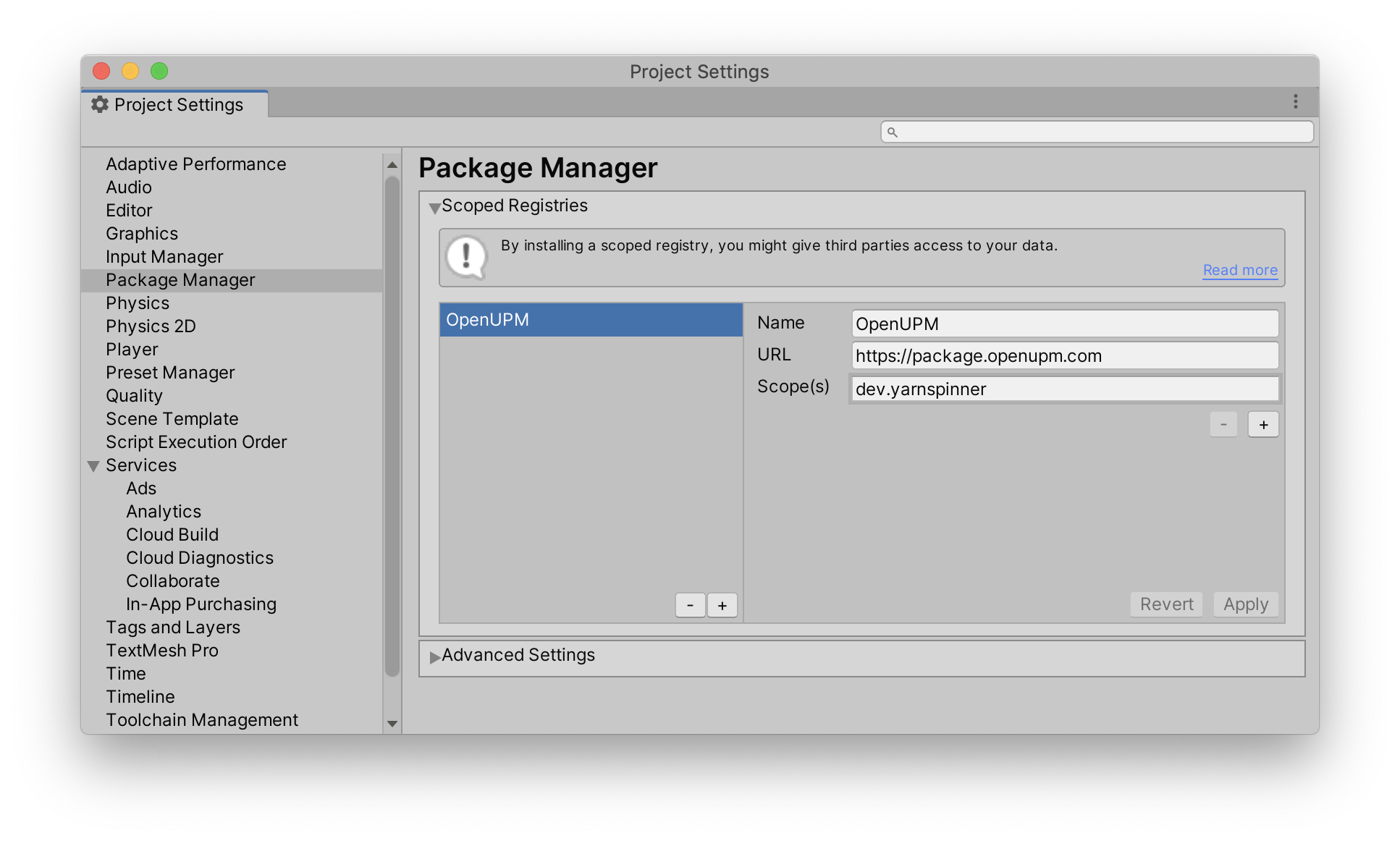 Before you can install Yarn Spinner from OpenUPM, you first need to configure your project so that it knows where to get the package from.