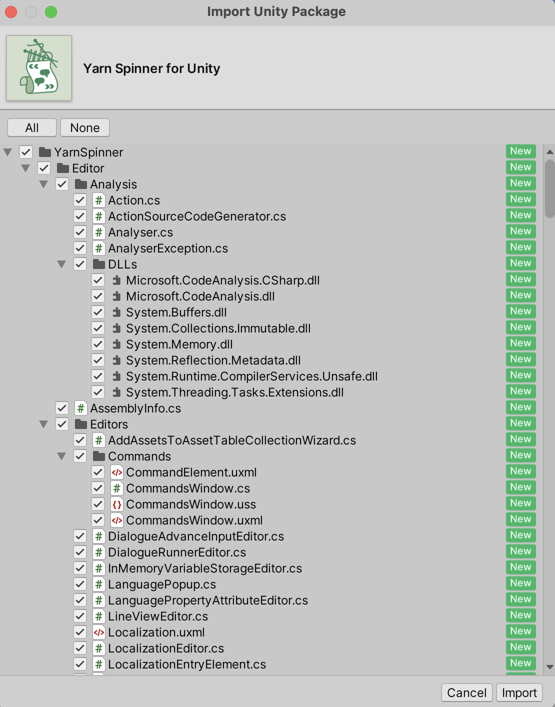 This will trigger the Import Unity Package workflow, where you can use the Import button to add the Yarn Spinner for Unity package to your project: