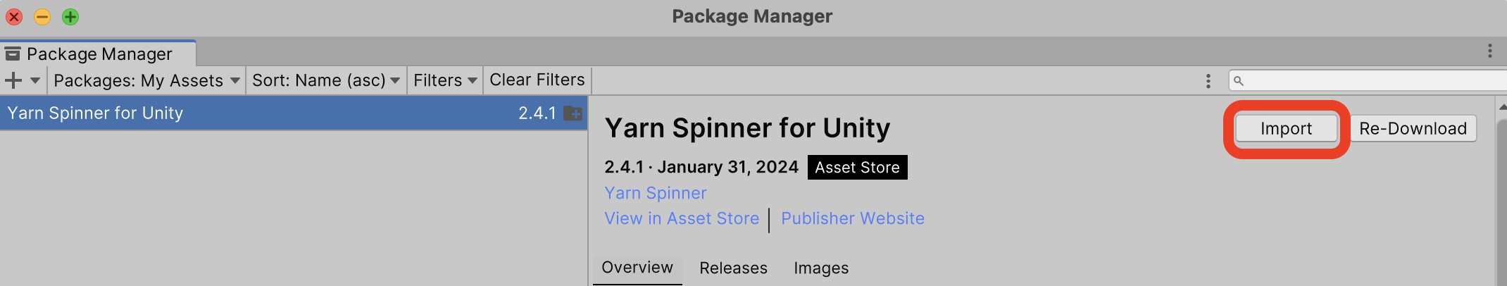 Once Yarn Spinner for Unity has downloaded, you can use the Import button to start the process of adding it to your project: