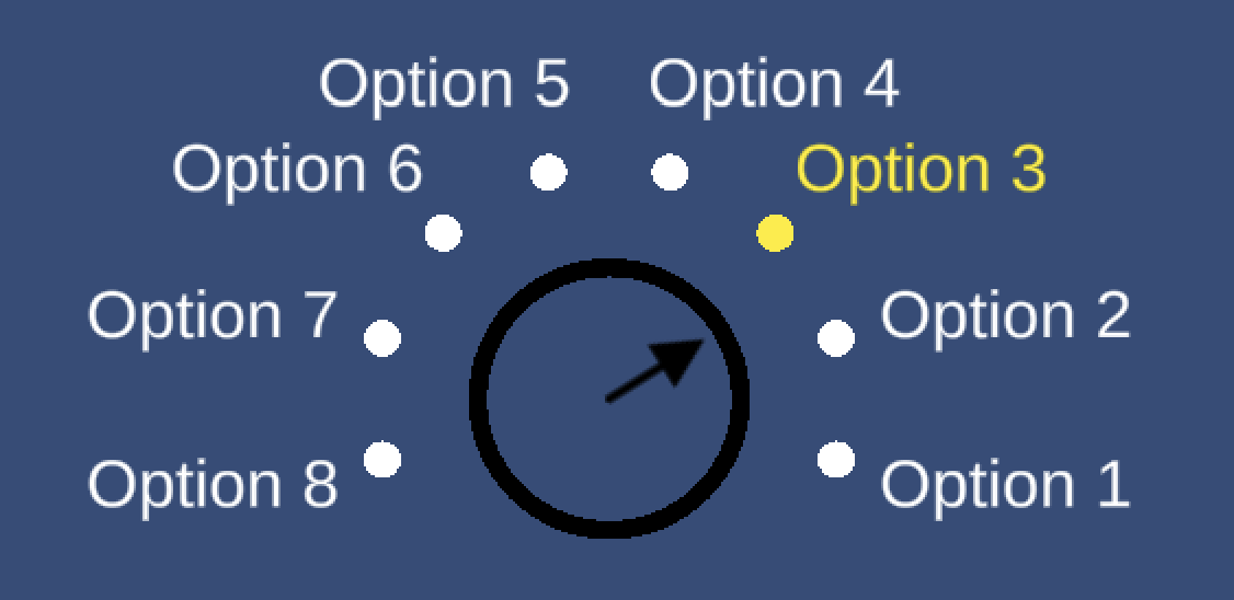 The Image Wheel provides a dialogue wheel with a light scif-fi appearance, and support for up to six segments, and the ability to specify exactly which of the segment positions is used for an option in your Yarn scripts.