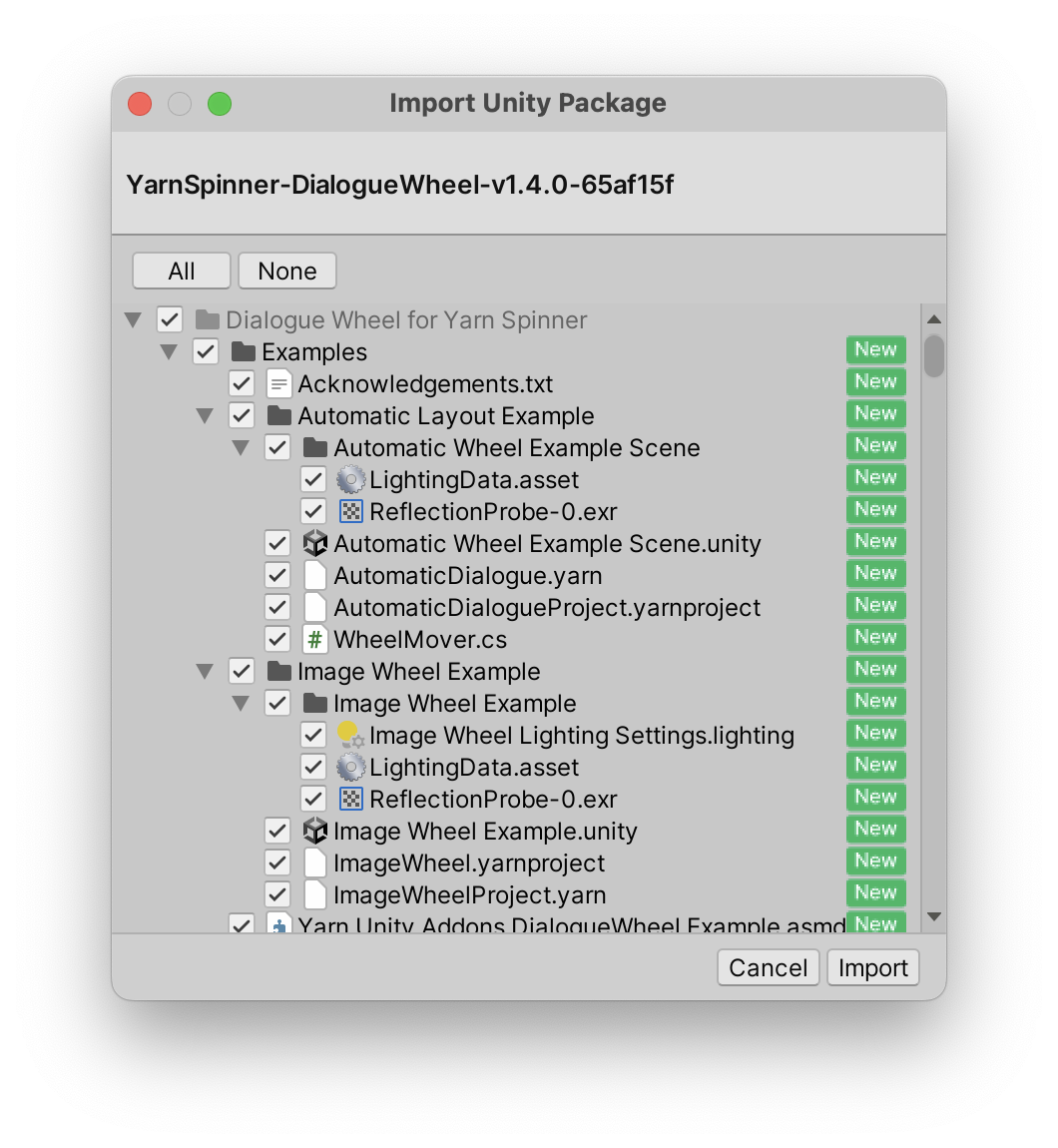 Click the Import button, and Dialogue Wheel for Yarn Spinner will be imported into your project.
